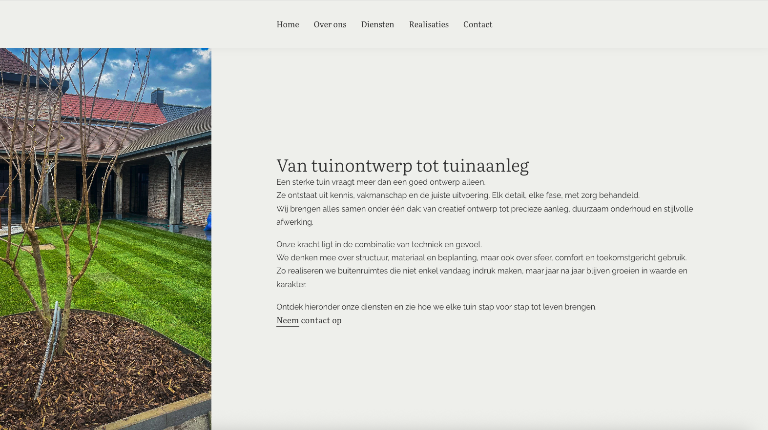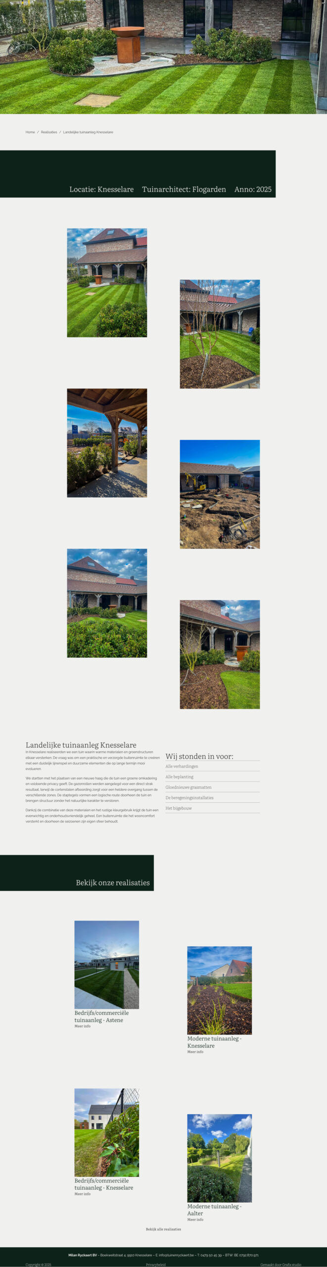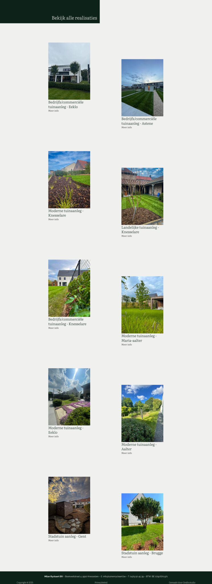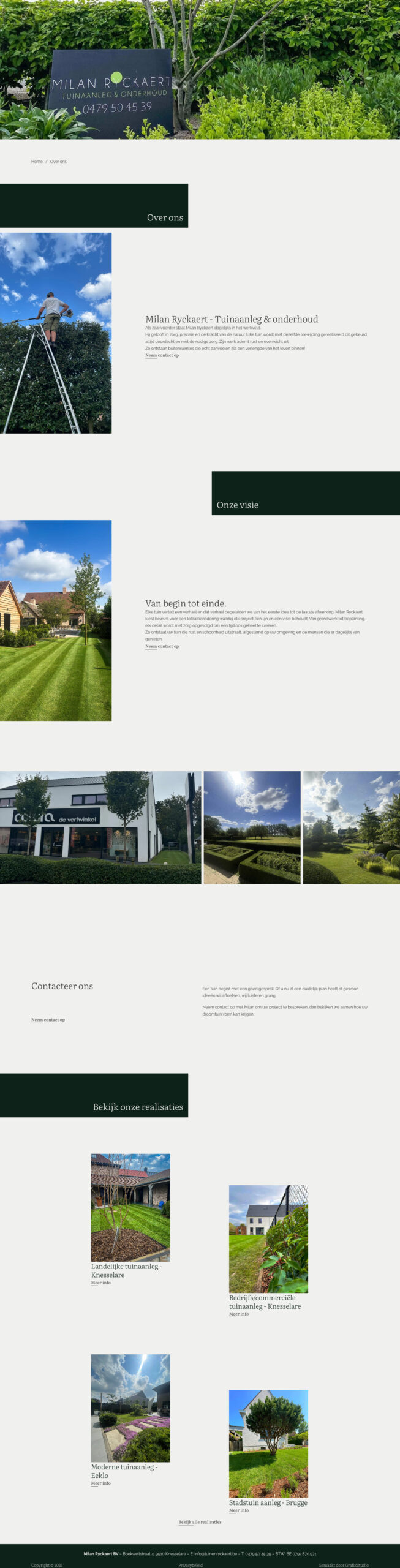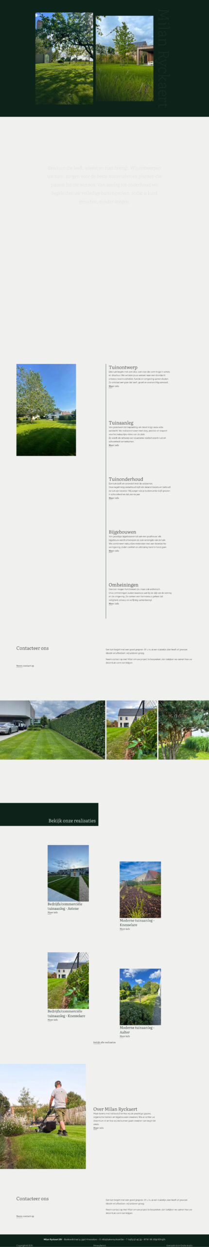 De website van Milan Ryckaert Tuinaanleg & Onderhoud moest rust en elegantie uitstralen, met een duidelijke focus op de realisaties. We speelden bewust met witruimtes en voldoende ademruimte in het ontwerp.