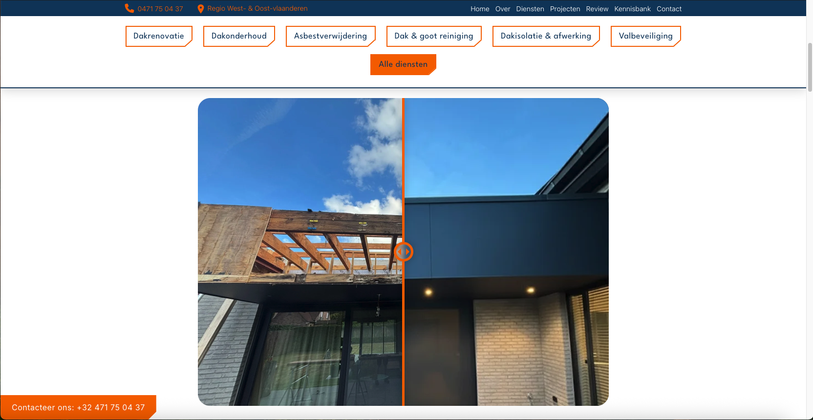Om het verschil tussen vóór en na de dakrenovatie helder te tonen, maakten we gebruik van een interactieve slider. Zo zie je in één oogopslag de oorspronkelijke staat van het dak en hoe strak en afgewerkt het resultaat er na de renovatie uitziet.