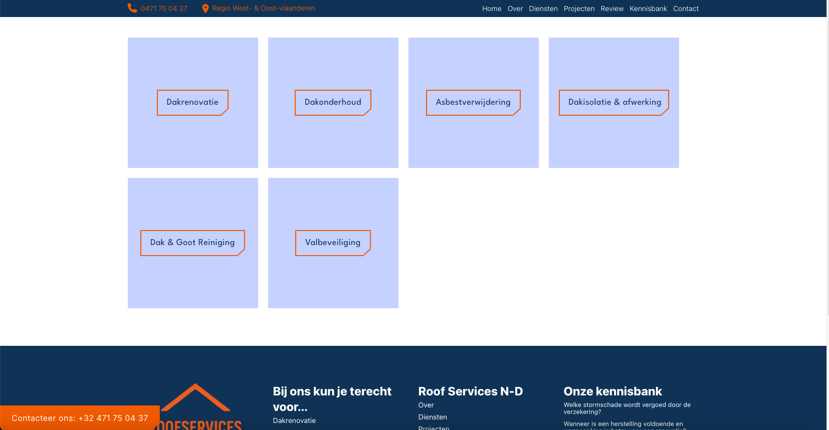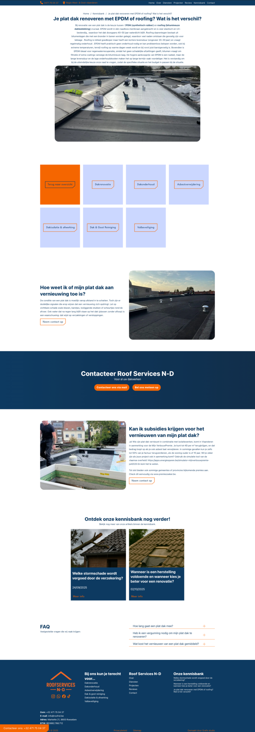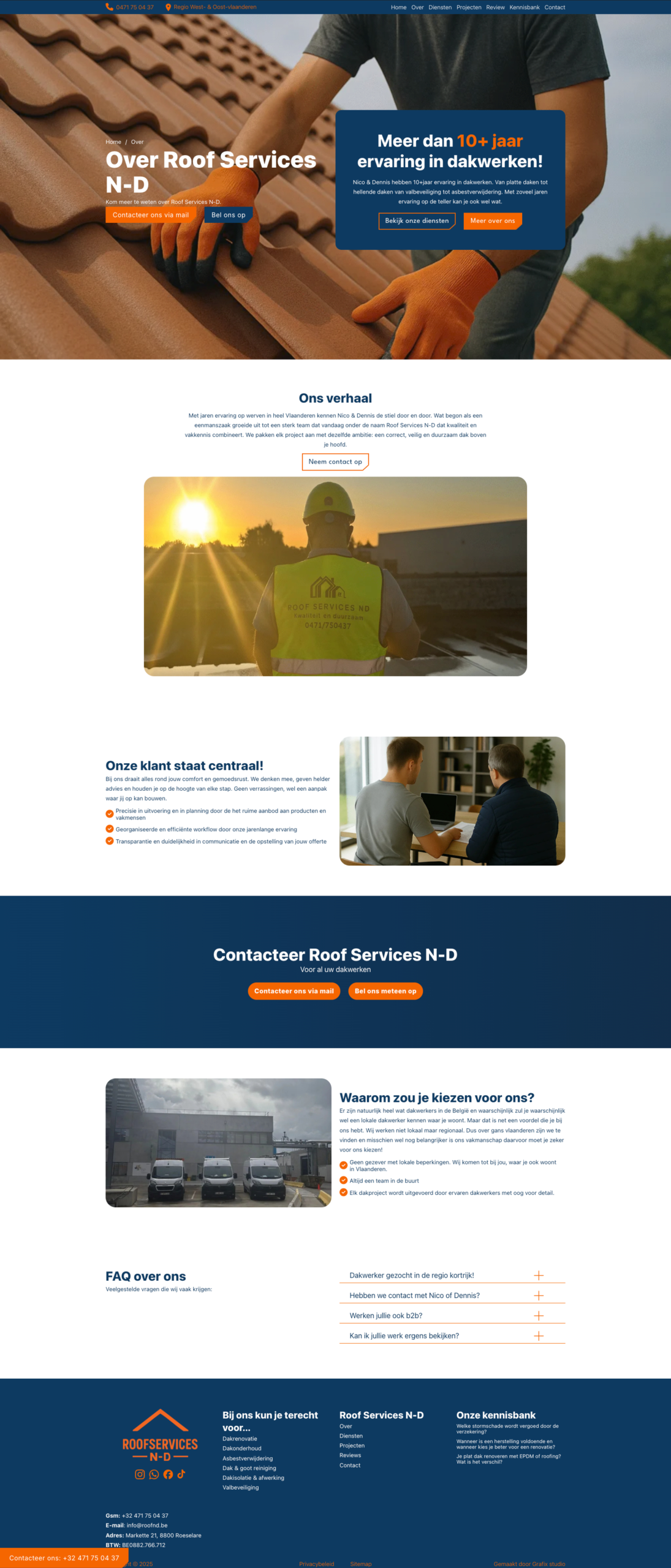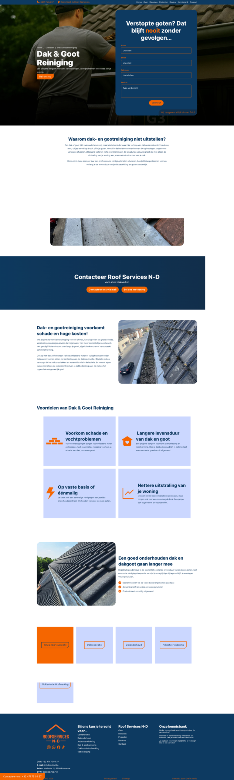 Door het brede aanbod aan dakwerken hebben we de diensten zo duidelijk en visueel mogelijk uitgewerkt. Bezoekers vinden daardoor snel de juiste dienst, kunnen gericht doorklikken en meteen inschatten of Roof Services N-D de juiste partner is voor hun specifieke dakproject.